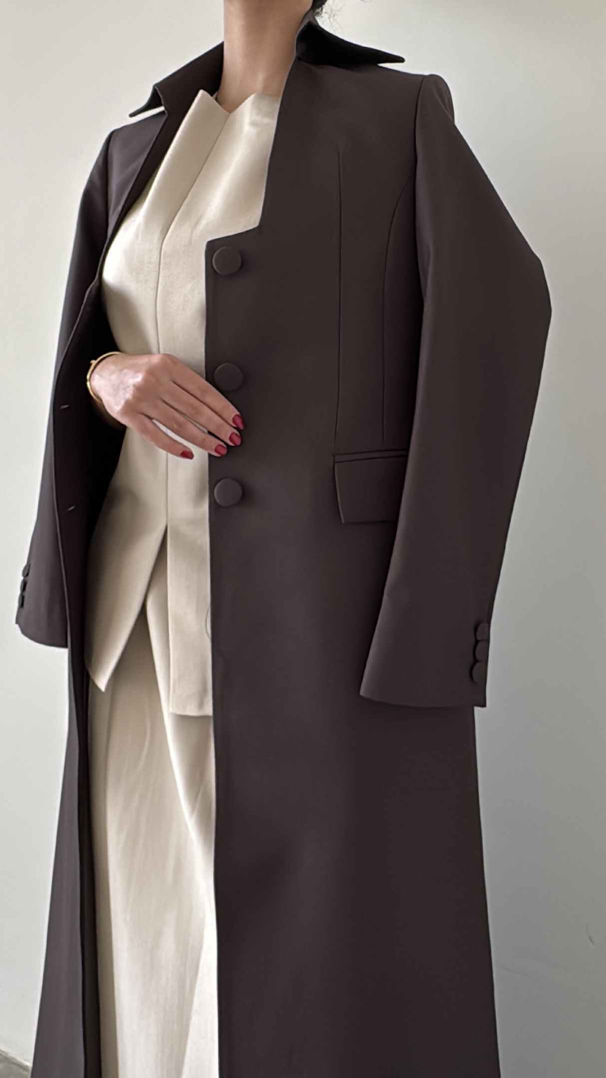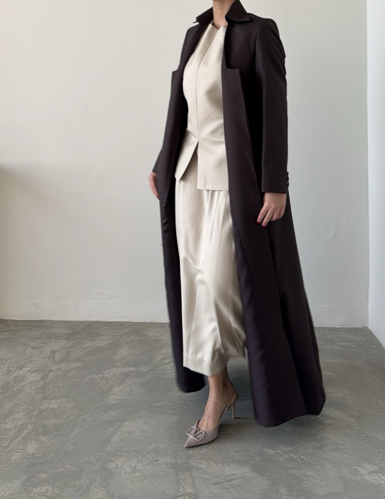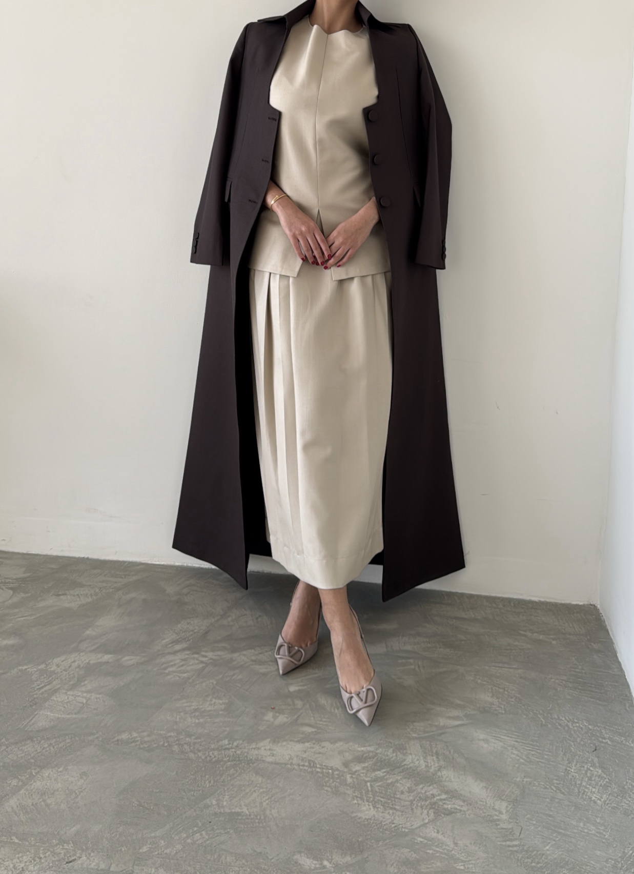 modern, elegant set crafted with clean lines and a structured silhouette. The top features a minimal front slit, paired with a soft-pleated skirt for effortless movement. The look is completed with a long classic coat for an elevated finish. Dry clean only. SIZE CHART